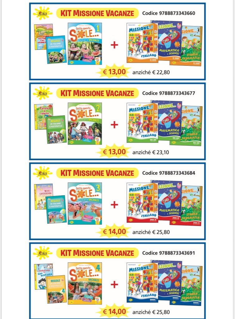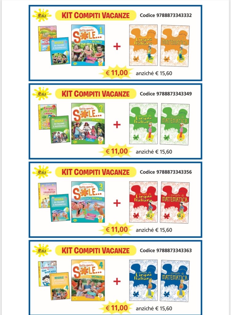 Anche quest’anno l’interessantissima offerta di Gaia Edizioni che propone un pacchetto composto dal libro delle vacanze “sotto questo sole“ (con narrativa italiano e inglese e libro delle regole) affiancata dai quaderni operativi dell’anno successivo di italiano e matematica “I compiti di…”