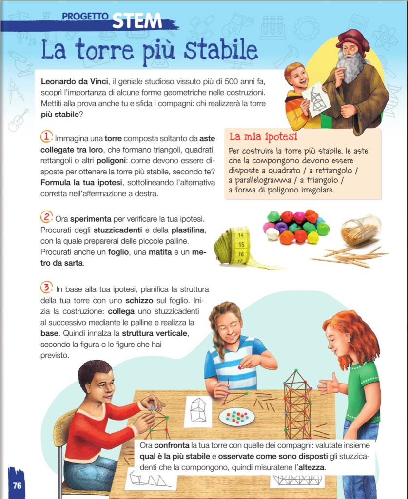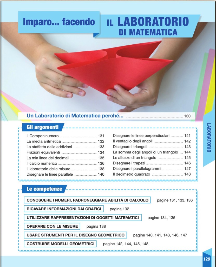 Per il fascicolo di matematica (in caso di adozione tra l’altro riceverai il “libro docente” completamente corretto nello sviluppo degli esercizi) al posto del metodo di studio la rubricatura riporterà la voce LABORATORI: una matematica del fare avvincente e creativa, dove spicca il percorso di geometria.