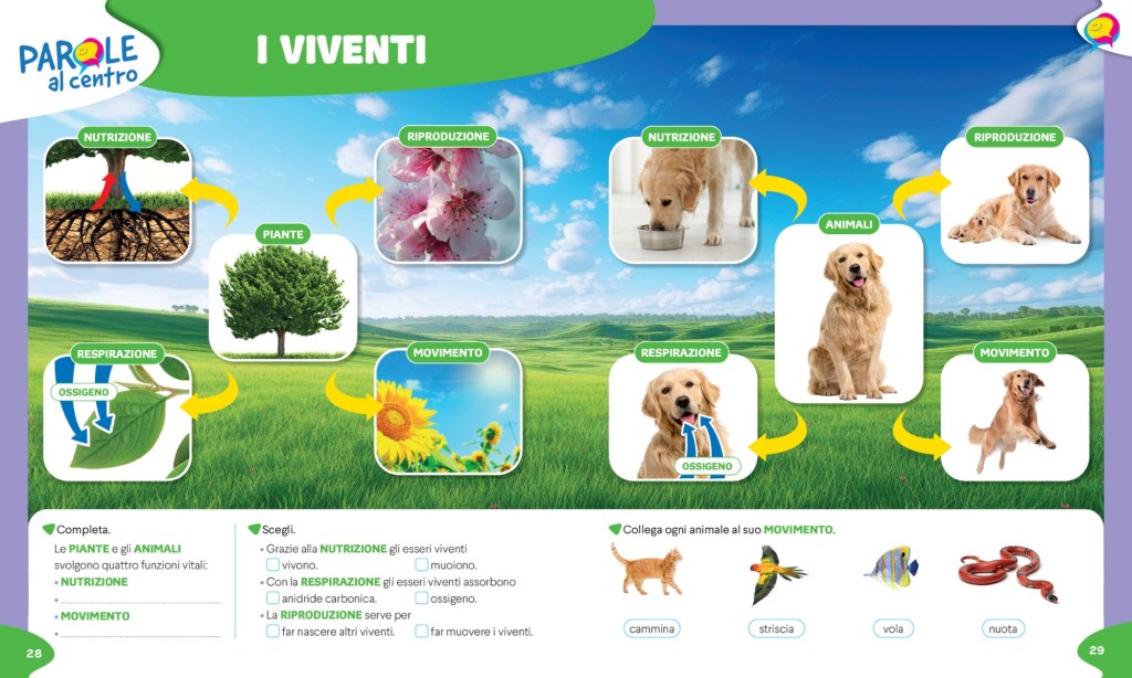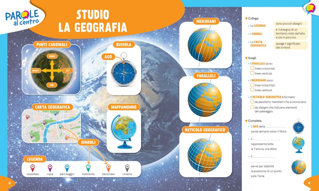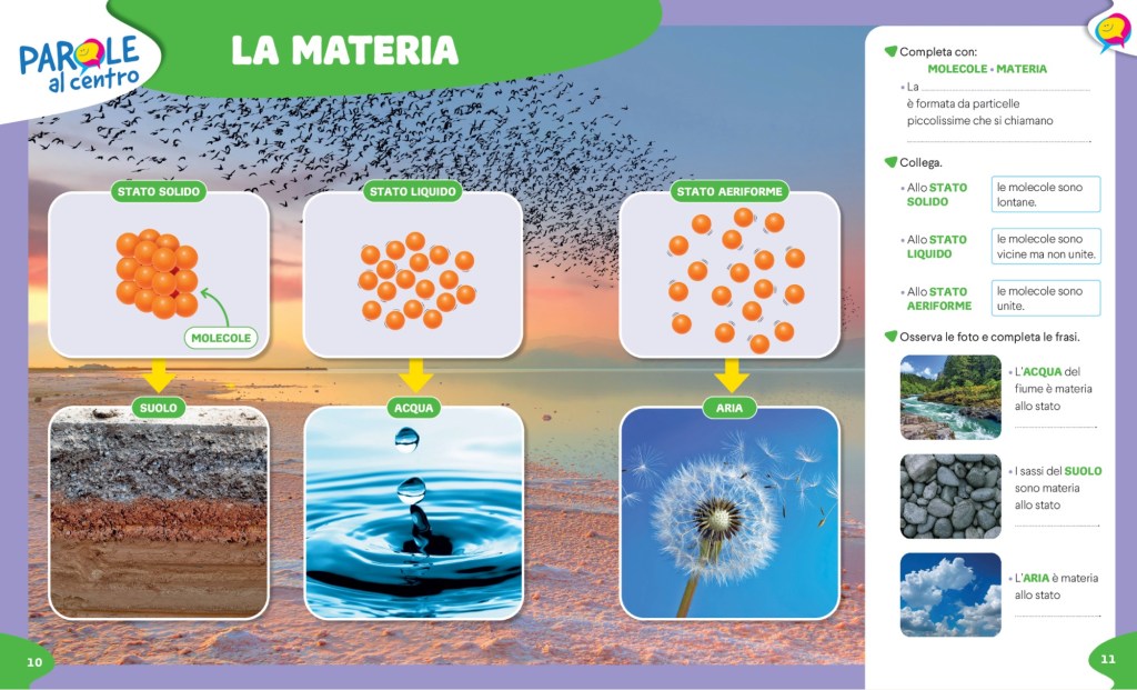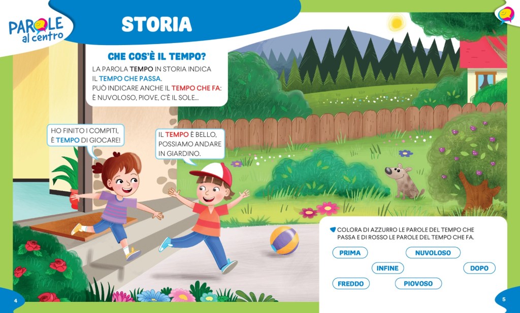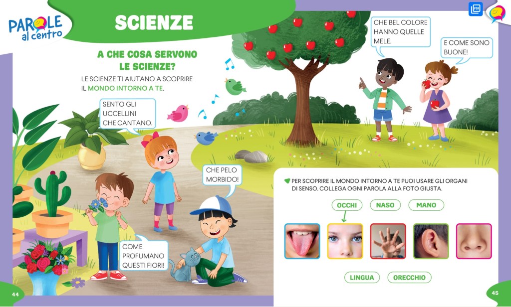 – Ogni argomento viene aperto da un lavoro sul lessico di base e sul lessico disciplinare con PAROLE AL CENTRO (doppie pagine che spesso possono essere riprese alla fine dell’argomento per il consolidamento)
