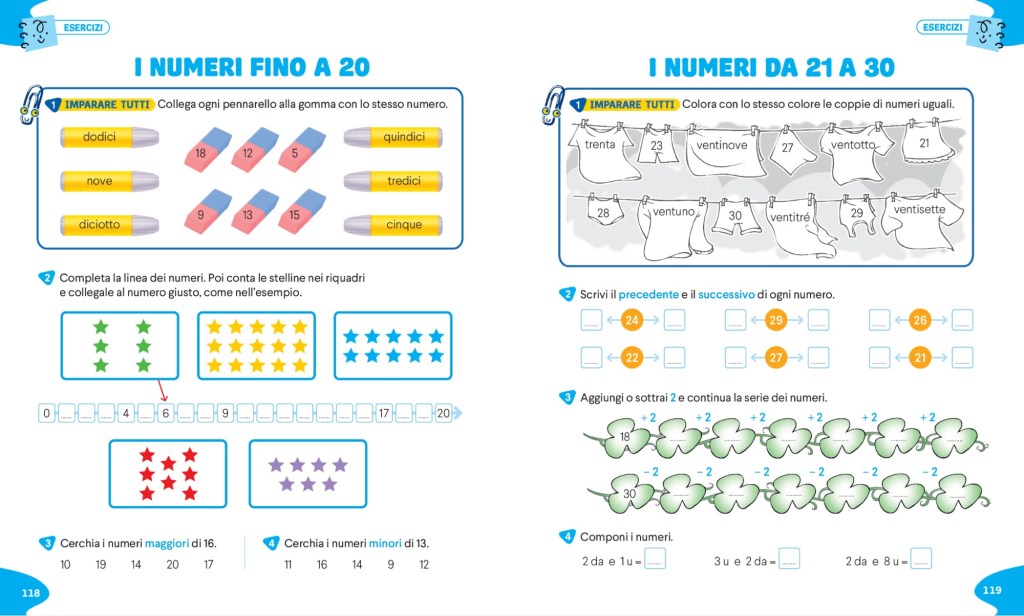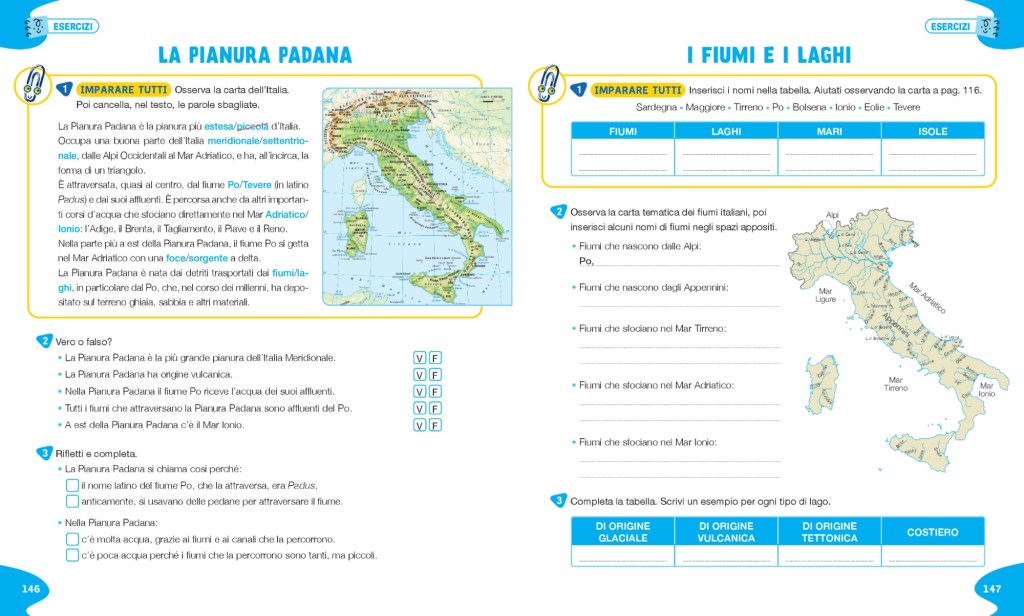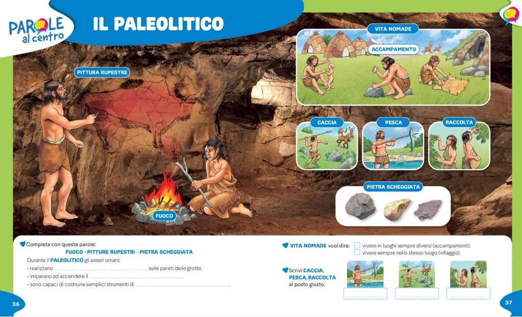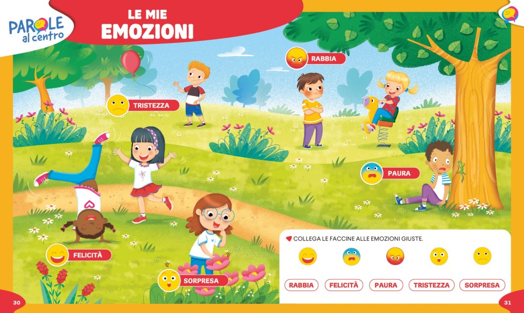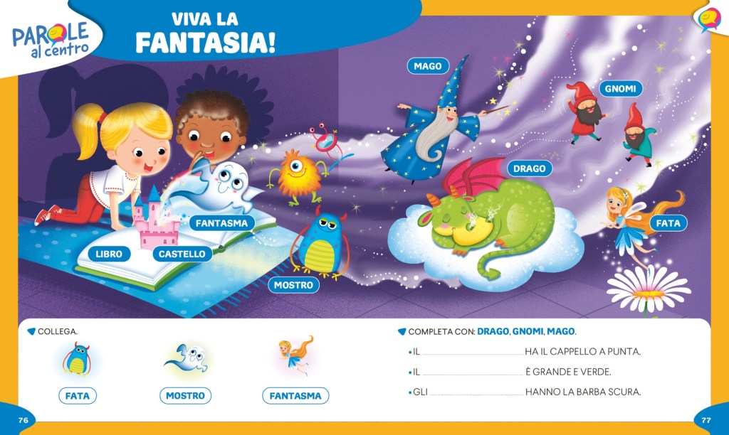 – Ogni argomento viene aperto da un lavoro sul lessico di base e sul lessico disciplinare con PAROLE AL CENTRO (doppie pagine che spesso possono essere riprese alla fine dell’argomento per il consolidamento)
