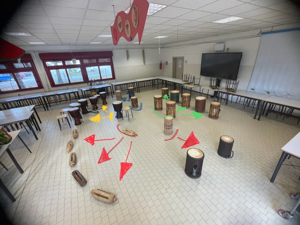 Da molti anni tengo laboratori nelle scuole per introdurre bambine e bambini alle percussioni dell’Africa dell’Ovest, in particolare l’orchestra che chiamo “Orchestra Djembe”, composta da cinque gruppi di tamburi diversi: